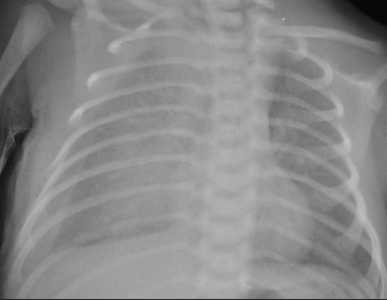 Figure 1 Chest x-ray demonstrating the presence of pleural effusion at 30 min of age. |