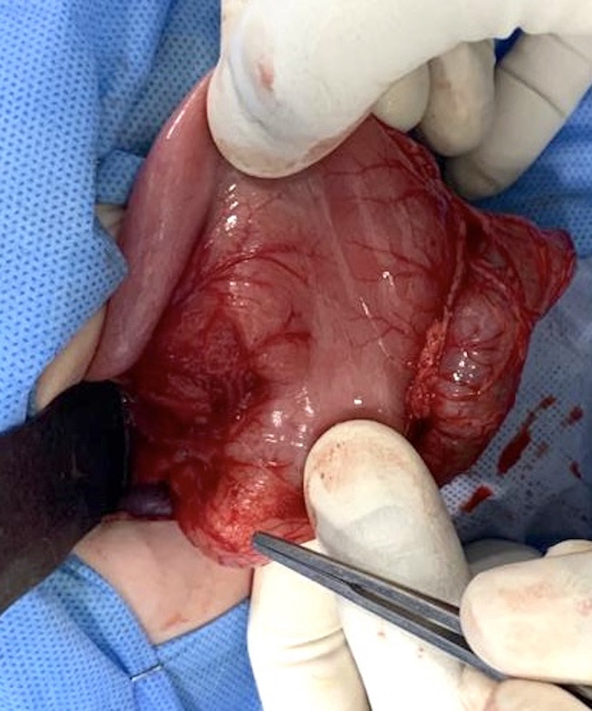 A clinico-radiological diagnosis of duodenal duplication cyst was considered and the baby was taken up for surgery. Intra-operative findings included a bulky pylorus with a thickened wall on the side of the lesser curvature and a normal wall on the greater curvature. No other lesion was seen separately (Fig. 2). On incising the anterior surface of the pylorus longitudinally, a cystic mass of 1 x 2 cm was seen adjacent to the pylorus towards the lesser curvature compressing the pylorus, resulting in gastric outlet obstruction (Fig. 3). The duplication cyst was found to share a wall with the pylorus however was not communicating with the pyloric channel. The cyst was excised, a Heineke-Mikulicz pyloroplasty was done and a feeding jejunostomy was made to initiate early feeding.
