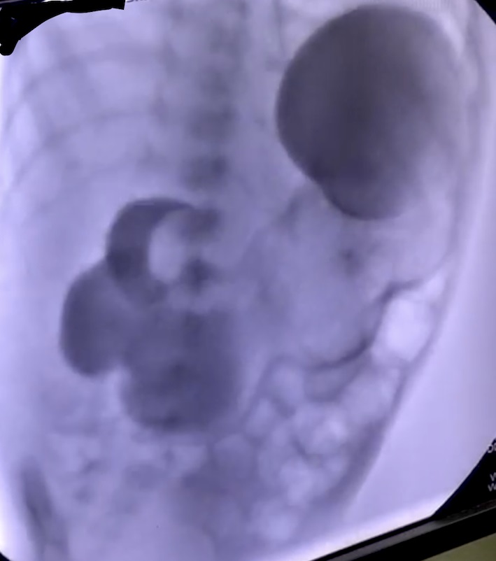 On arrival, the child weighed 2.6kg, heart rate was 124 per minute, respiratory rate was 40 per minute and there was mild dehydration. Oxygen saturation was 98% on ambient air. The abdomen was not distended, there was no visible peristalsis, no mass palpable per abdomen, and bowel sounds were normal. On the X-ray abdomen, the stomach appeared distended and there were a few air shadows in the small bowel. On Ultrasonography (USG) of the abdomen, there was a cystic lesion with bowel signature measuring 12.1mm x 20.6mm x 22.5mm, inferomedial to gall bladder suggestive of enteric duplication cyst. Venous blood gas analysis revealed mild alkalosis with a pH of 7.46. Serum sodium was 133mEq/L and serum potassium was 3.5mEq/L. On oral contrast study, there was no flow of contrast distal to the second part of the duodenum (Fig. 1).
