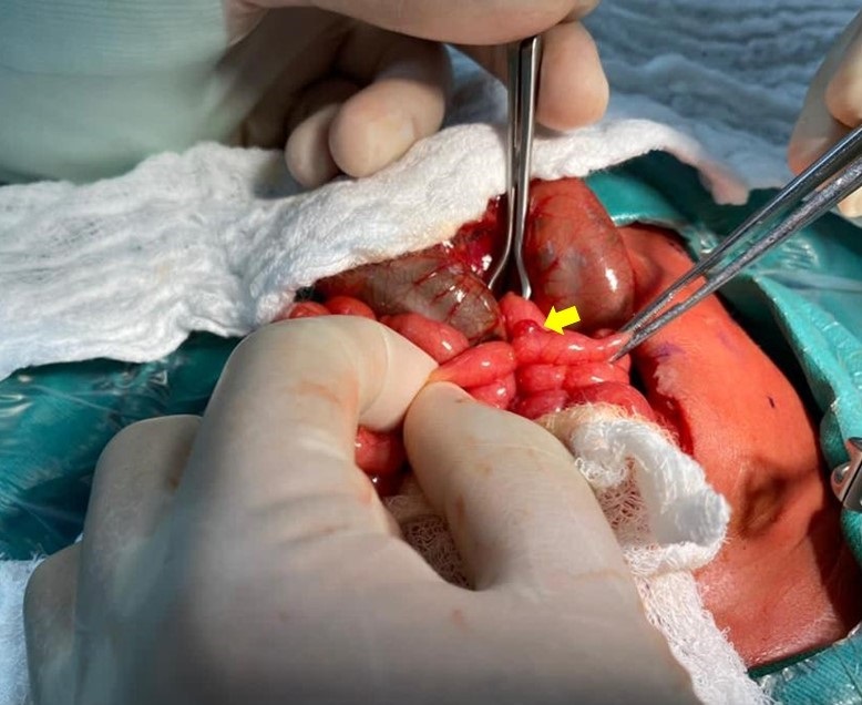 The pediatric surgery department was consulted for surgery. Laparotomy was performed, which showed dilated intestinal loops and a 1x1 cm mass located 15 cm distal to the Treitz angle on the antimesenteric border (Fig. 1). The mass was resected, and end-to-end jejuno-jejunal anastomosis was performed. Due to the anorectal malformation, a divided colostomy was created at the descending colon level. The patient went back to the NICU intubated.