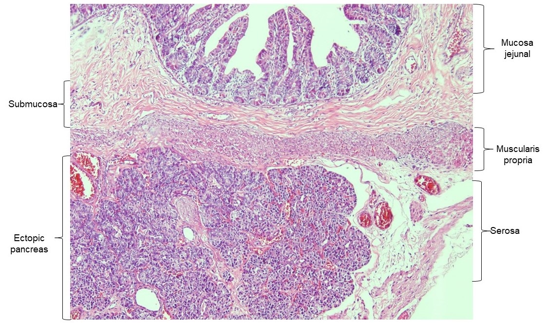Histopathology of the resected jejunum showing pancreatic tissue in the serosa. |