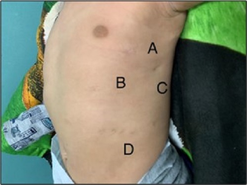 There is no consensus on whether to use a chest tube on CDH repair, some studies as Schlager et al support its use.[13] Others recommend its use but suggest its retrieval as soon as possible.[4] Chest tube was placed on 2 of our patients. Good outcomes were obtained regardless of chest tube placement. The length of hospital stay in our patients was a mean of 22.25 days (Range: 10-35 days), similar to Putnam et al.[11] One of the advantages of thoracoscopy is fewer scars. (Fig. 3)
