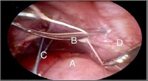 The patient was placed on right lateral decubitus, working ports are marked. A. Scapula; B. 3mm lens; C. 3 mm trocars; D- Reverdin needle insertion site. |