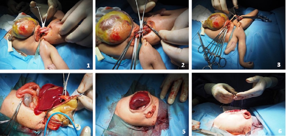 Twin’s separation with isolation and ligation of the pedicle and omphalocele’s primary closure. |