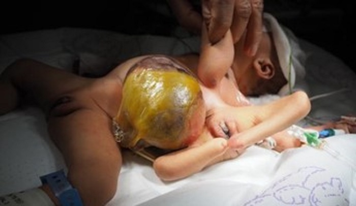 Heteropagus twins with omphalocele. Parasite presents with dysmorphic legs and arms, pelvis, buttocks, and genitalia. |