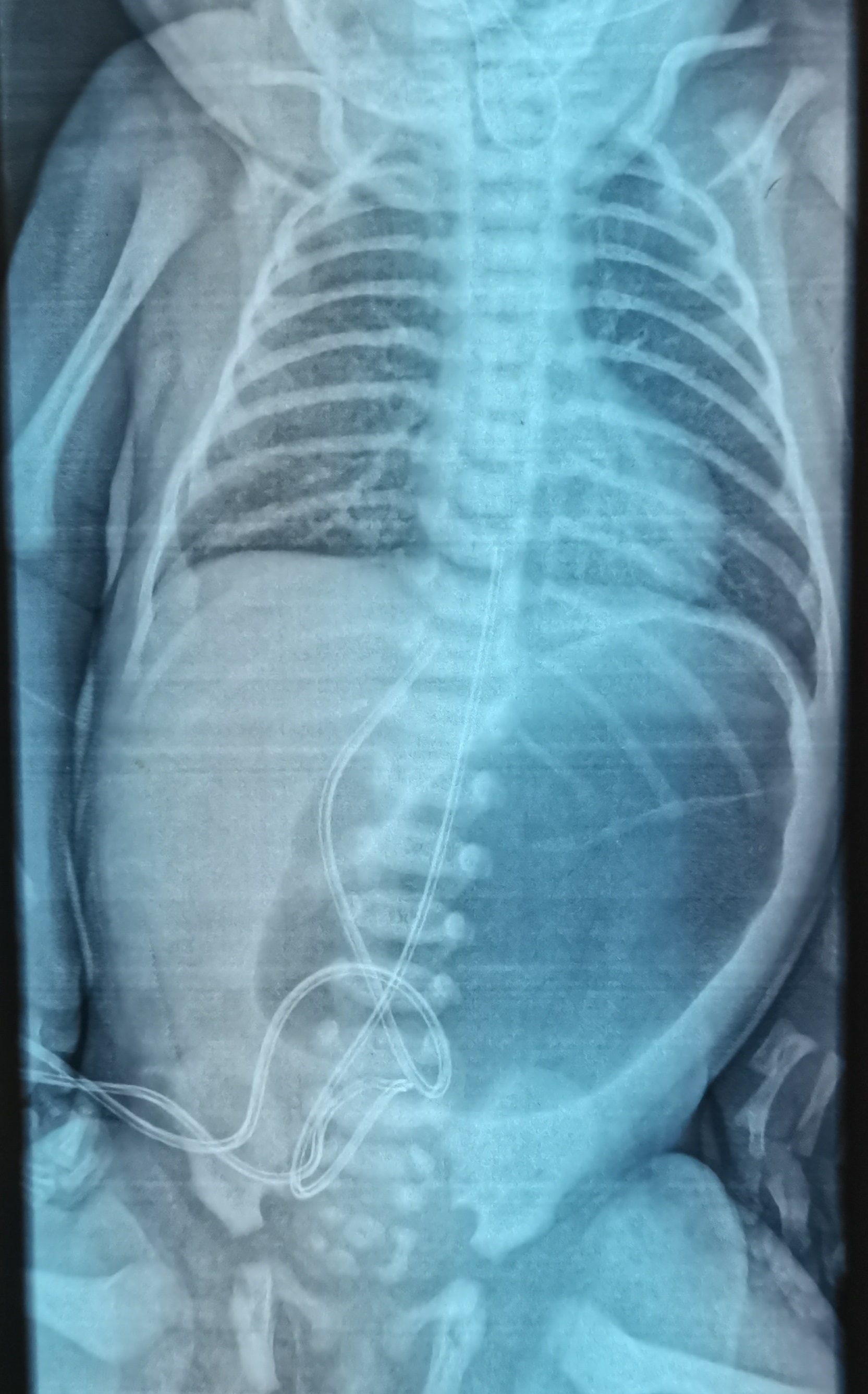 Infantogram showing Coiling of NG tube in the upper thorax and dilated stomach and duodenal cap with no distal gas. |