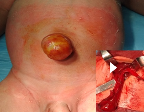 An 11-day-old male neonate delivered by C-section presented to the emergency department with the misdiagnosis of umbilical hernia. The physical examination found a hernia of the umbilical cord with a defect of 3cm, and a small non-reducible umbilical mass covered with a thick and opaque membrane. The newborn has no other physical anomalies. Laboratory tests were also within normal ranges. The abdominal US was poorly contributive, and the radiologist concluded that there is an intraperitoneal structure within the sac without anomalies of the hepato-biliary and urinary tracts.