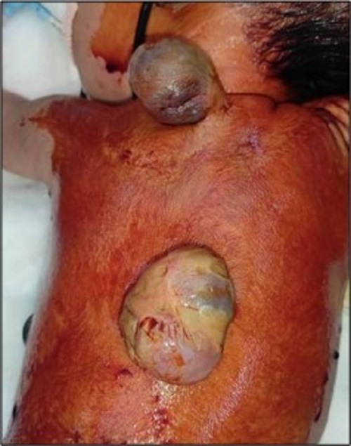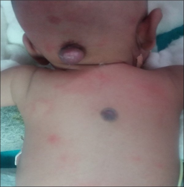 Case 2: A 26-day-old female baby presented with a complaint of minor swelling over the back of the head since birth. The baby was full term, born by normal vaginal delivery. There was no history of antenatal detection of any congenital malformations. On examination- there was a small cystic swelling of size 2 × 1 cm in the occipital region with a narrow stalk. There was another small swelling of size 1 × 1 cm in the thoracic region with blackish discoloration of the skin around the swelling (Fig. 2). Ultrasonography of the lesions was suggestive of the occipital encephalocele and thoracic meningomyelocele respectively. USG cranium was also normal. The patient was planned for surgery and both the lesions were excised and the defects repaired. The patient had an uneventful recovery and at 1-year follow-up, no neurological deficit or hydrocephalus was noted.