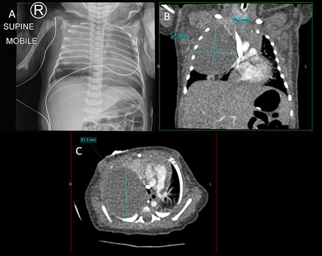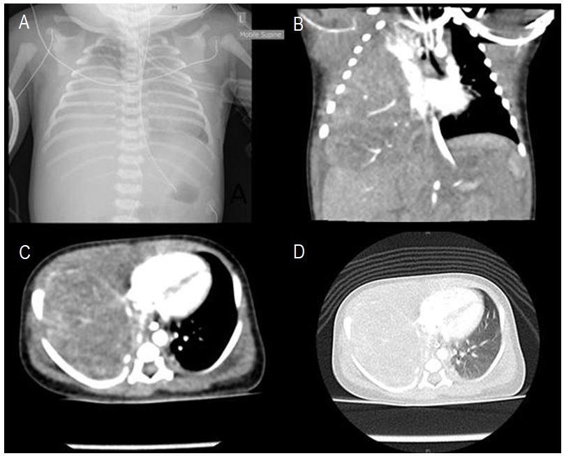 A female infant was born at 39+6 weeks gestation via vaginal delivery. Apgars at birth were 7 and 9. Antenatal scans showed possible polyhydramnios. After birth, she developed respiratory distress. Chest x-ray (Fig. 1) showed a homogenous opacity in the right hemithorax with only a small amount of aerated lung at the apex with the associated mediastinal shift. She was intubated and then transferred to our specialist pediatric hospital for ongoing management. An ultrasound showed extensive opacity in the right hemithorax due to a large mass with some small cystic spaces. A CT chest with contrast (Fig. 1) demonstrated a solid appearing lesion occupying most of the right hemithorax without any air-filled components. Alpha Fetoprotein and Beta HCG were normal for a neonate. Preoperative echocardiography showed a structurally normal heart, however, pulmonary hypertension was noted. The differential diagnosis at the time included Cystic Pulmonary Adenomatoid Malformation (CPAM) or Pleuropulmonary Blastoma (PPB).