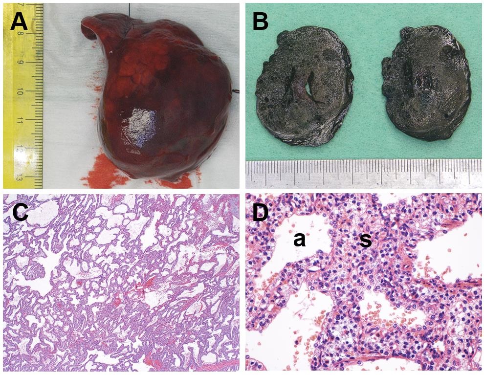 Pathological features of Case 2. A. Right lower lobe resection containing a well-circumscribed tumor. B. On sectioning, the tumor exhibited a solid and cystic cut surface. C and D. Low power (C) and high power (D) view of the tumor (hematoxylin and eosin stained sections) showing airspaces (a) lined by bland cuboidal cells and surrounded by thickened septa (s) containing an infiltrate of cells with clear cytoplasm. |