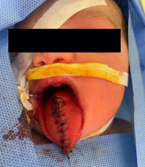 Intraoperative demonstration of a large mass originating from the palate, bifid tongue, and sublingual mass. |