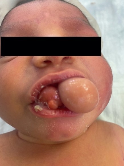 A 2-day-old newborn with two large masses protruding from the oral cavity. |