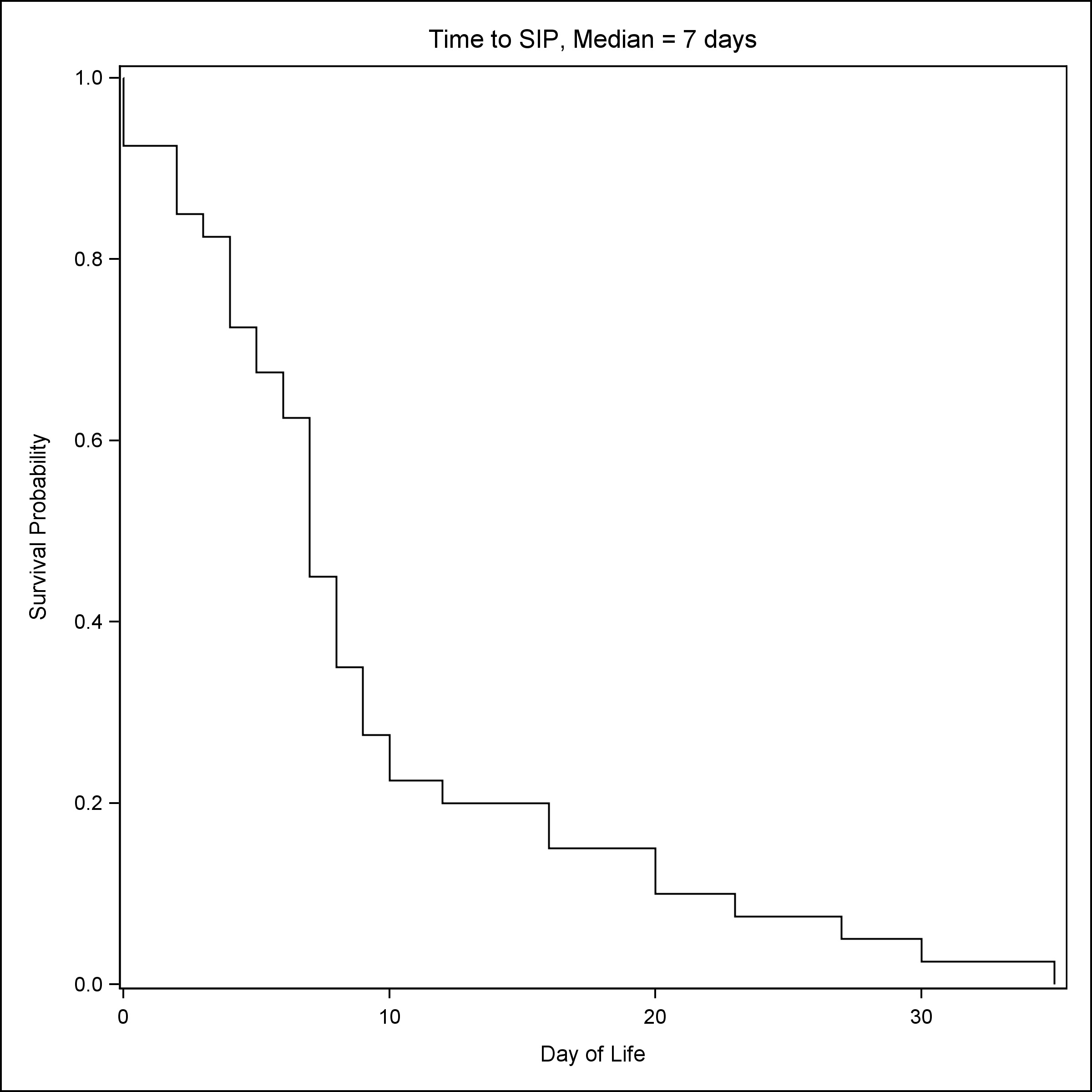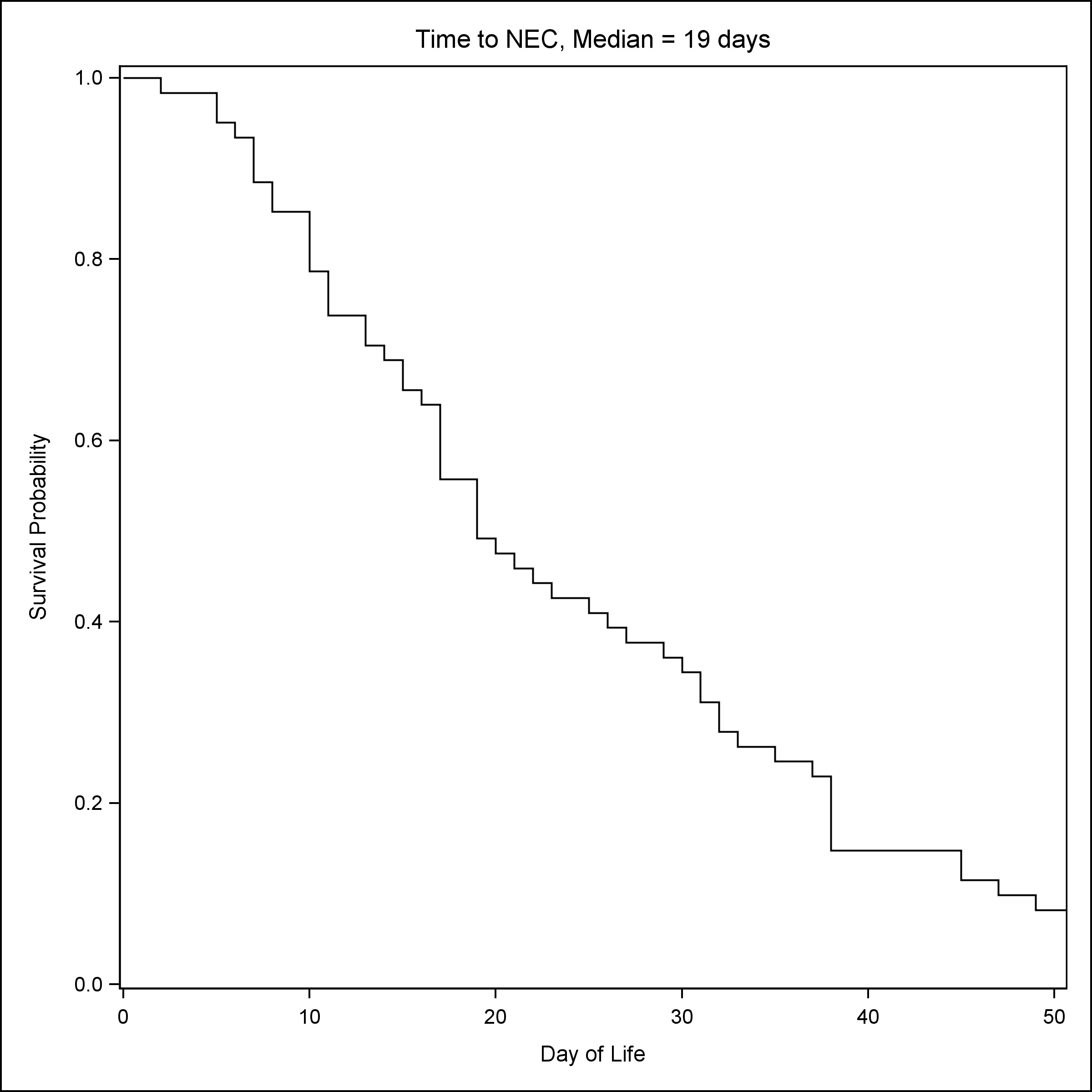 A total of 239 neonates were included in the study, 40 had a clinical diagnosis of SIP, 61 had stage II or stage III NEC, and 138 neonates were controls matched for GA and BW. As compared to NEC patients, patients with SIP were more likely to be male (72.5% vs 47.5%) and had lower GA [Median (Q1, Q3): 25.1 (23.8, 28) vs 27 (25.1, 31.1)] and lower BW [Median (Q1, Q3): 690 (585, 1072) vs 960 (680, 1560)] (Table 1) . NRBCs at birth were the lowest in groups that later developed NEC [Median (Q1, Q3): NRBC count 10/100 WBC: 9 (5, 29)] (Table 1). Consistent with established reports, the median time to SIP was seven days (Fig. 1), whereas the median time to NEC was 19 days (Fig. 2).