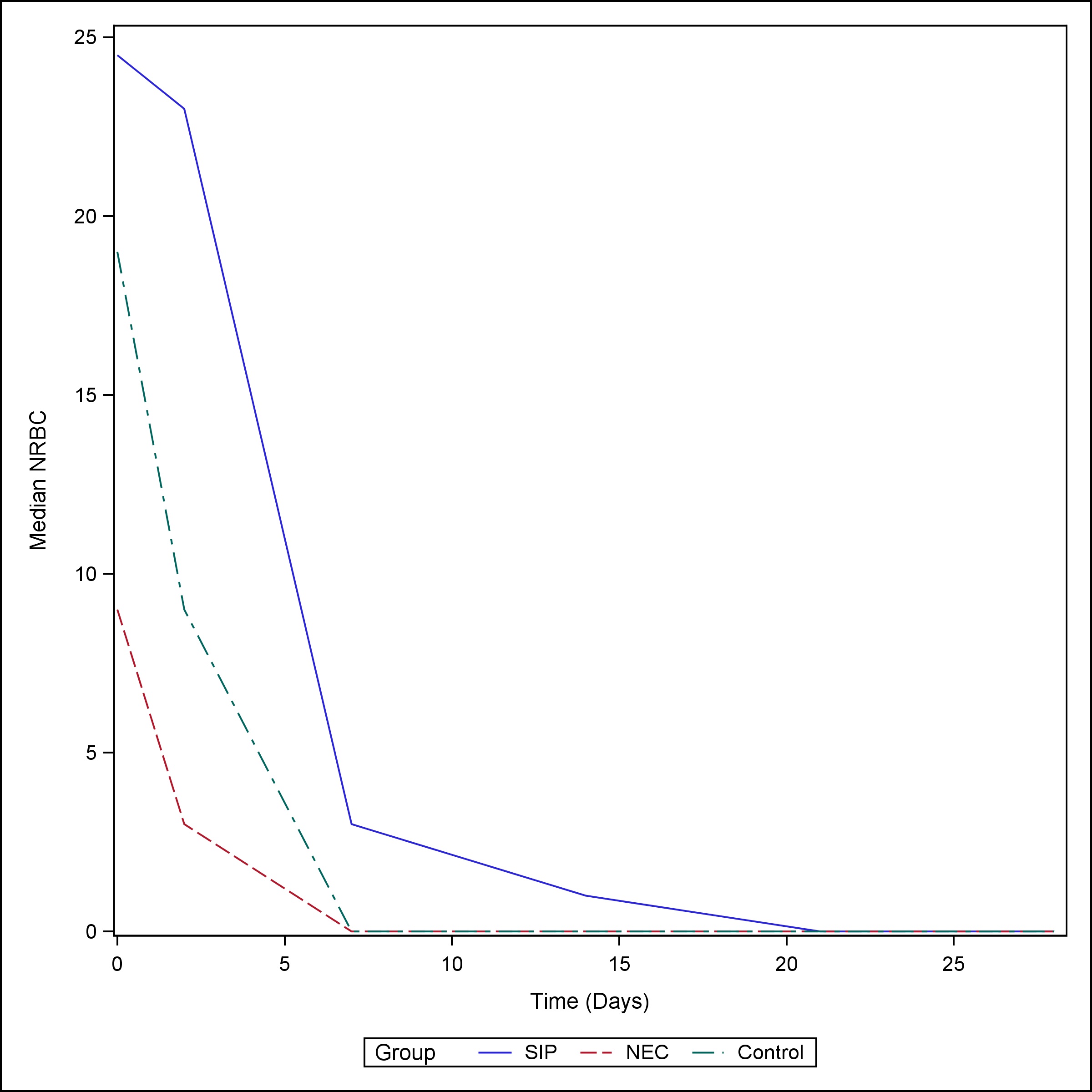 Median NRBC by the group over time. |