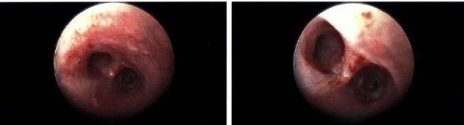 Pictures from Laryngotracheobronchoscopy procedure showing erythema at carina and possible old injury. |