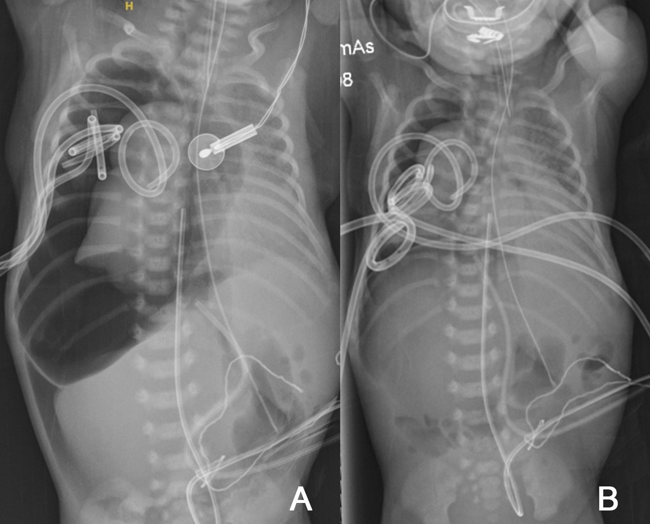 An iatrogenic tracheobronchial injury was suspected. On day 2, he developed a greater oxygen requirement; transillumination and radiography confirmed persistent pneumothorax, this time with pneumomediastinum and pneumoperitoneum, requiring a third chest drain. He was then transferred to the regional pediatric center. After a fourth TT (Fig. 2B) due to a massive ongoing air leak (Fig. 2A), high-frequency oscillatory flow ventilation (HFOV) was tried.