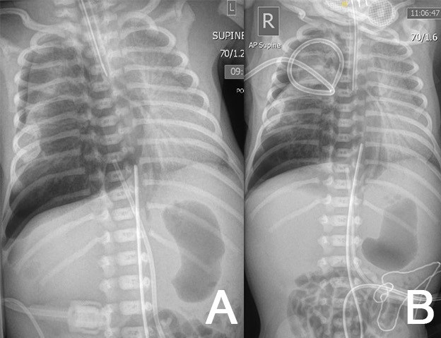 At 3 hours of age, due to sudden loss of chest movements and volumes on ventilation, the neonate was re-intubated. There was ongoing respiratory distress and CXR confirmed a right-sided tension pneumothorax (Fig. 1A). Needle aspiration followed by tube thoracocentesis (TT) with the underwater seal was undertaken (Fig. 1B) . The drain was placed on low-flow suction. One hour later, further desaturation and transillumination indicated a large residual pneumothorax, necessitating a second chest drain, also placed on low-flow suction. Ventilation improved and he remained on 25% FiO2.
