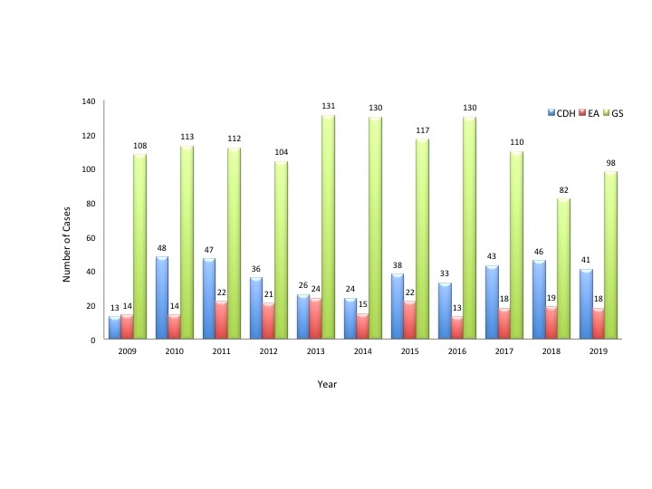 The number of Congenital Diaphragmatic Hernia (CDH), Esophageal Atresia (EA), and Gastroschisis (GS) cases in South Brazil per year, 2009-2019. |