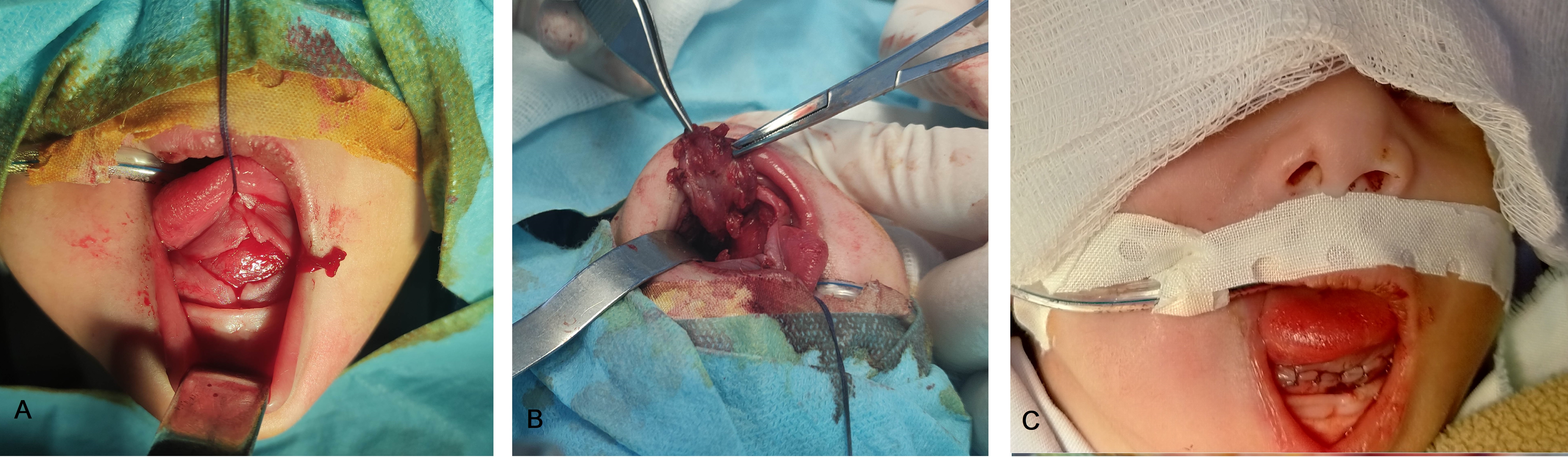 In a newborn, the physical examination at birth revealed no abnormalities except a minor swelling under the tongue. The newborn was feeding well without any difficulty and had normal breathing. Physicians decided on a conservative approach with regular follow-up. Two weeks later, the sublingual pseudocyst had grown significantly causing feeding and breathing difficulties, and a weight loss of 0.5 kg was noted. MRI showed an enormous and obstructive sublingual cyst measuring 22×18×17mm requiring an emergent surgical treatment (Fig. 1). Airway management was the main challenge for anesthesiologists. Parents were aware of the risks and gave their consent. After anesthesia induction, the intubation failed despite several attempts by experienced operators (Cormack: IV). We opted for the cyst puncture, allowing a better view (Cormack: II) for oral intubation with a 2.5 mm tube. The cyst excision was done under deep general anesthesia using a transoral approach (Fig. 2). The patient received 1 mg of dexamethasone and 150 mg of amoxicillin-clavulanic acid at the beginning of the intervention. The excision of the cyst was performed by giving an incision in the sublingual space over the cyst. The histologic examination showed a pseudocyst without epithelial lining, evoking a ranula. The patient was extubated 24 hours later after verifying the absence of oral edema and complications. The baby is now 2 months old and has no recurrence.