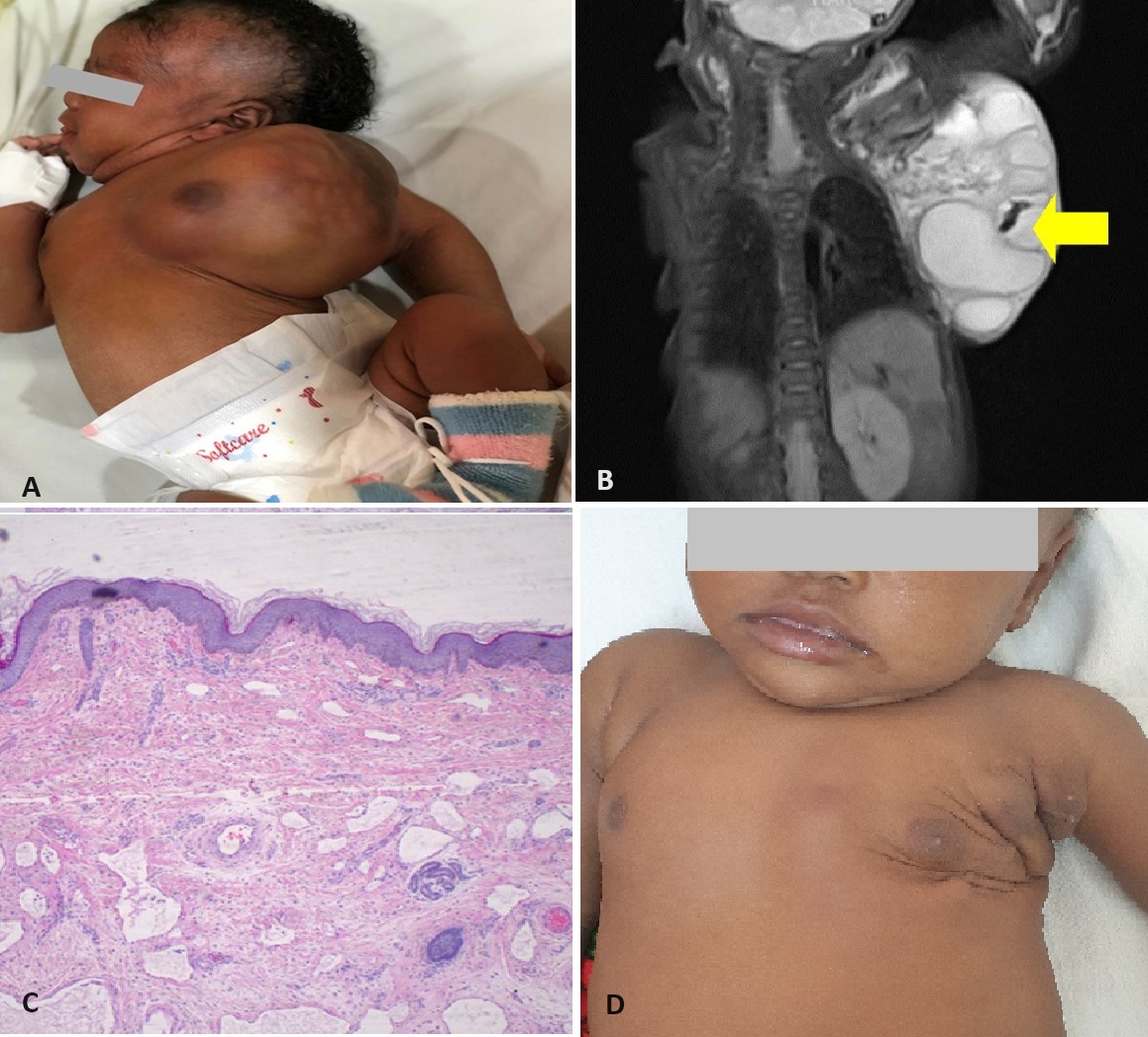 With a diagnosis of lymphatic malformation surgical excision was done on the 10th day of life. At surgery, multiple septated cysts were seen with yellow clear content. Excision of cysts was done with some lymphatic tissue left around the axillary region, a tube drain was inserted and the skin closed in layers. Postoperative recovery was uneventful whereby the drain was removed on day three and the baby was discharged on day seven. Her follow-up visits at the surgical and pediatric clinics were uneventful with normal upper limb movement and function. Histopathology analysis of the excised mass confirmed macrocystic lymphatic malformation (Fig. 1C). The baby is doing fine on a 6-month follow-up (Fig. 1D).