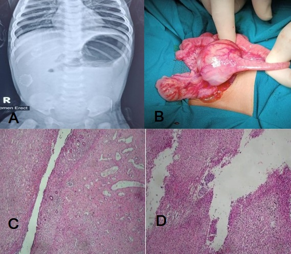 After taking informed consent and resuscitations, the patient was shifted to the operation theater and had an open exploration with the right-sided supraumbilical transverse incision. There was isolated jejunal dilatation approximately 5*5cm in size, 10cm from the duodenojejunal junction, having prominent serosal vessels around which the gut was twisted (Fig. 1B). Cecum was mobile and DJ was on the right side of the spine with multiple Ladd bands. The volvulus was not related to malrotation but rather secondary to segmental dilatation. The isolated segment of the jejunum on resection showed a single lumen with an abrupt transition to normal caliber bowel on either side. The SDJ was resected after de-twisting of the gut, and jejuno-jejunal anastomosis along with Ladd’s procedure was performed. The patient was shifted to the surgical intensive care unit for meticulous monitoring. Post-operative recovery was smooth and uneventful. The patient was discharged on the 6th postoperative day. Histopathology showed thinned-out bowel mucosa with ulcerations and underlying dense inflammation (Fig. 1C & 1D). The patient is doing fine on follow-up.