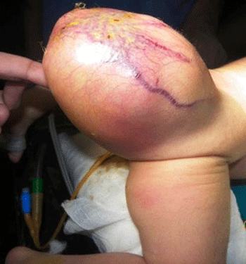 All of them had an obvious mass at lower back since birth (Fig. 1). Despite the presence of an obvious mass, only half of them were brought to hospital on day 1 of life. A delay of 5-18 days (mean 11 days) was seen in the other half of the patients. One antenatally diagnosed baby born by LSCS had rupture of the tumor with bleeding and had to be rushed for surgery. Another baby born by NVD at home presented at 11 days with rupture but no bleeding and was mistaken for a meningomyelocoele (MMC) preoperatively as the child also had an equinus deformity of right foot. One term baby born elsewhere by LSCS for meconium stained liquor, was referred to us with SCT (missed on 3rd trimester scan) and severe respiratory distress since 2 hours of life. Chest X-Ray revealed bilateral ground glass appearance and there was no evidence of cardiac failure. Echocardiography was normal. The baby was stabilized by neonatologists for probable meconium aspiration syndrome. Surgery was deferred till day 30 of life when his respiratory conditions had completely settled so that general anaesthesia could be given safely. Associated anomalies included cleft lip and palate in 1 patient and equinus deformity of foot in another. In half of them, the tumor size was 10 cm or more, the largest being 20 cms. Alfa-feto protein (AFP) was not done.