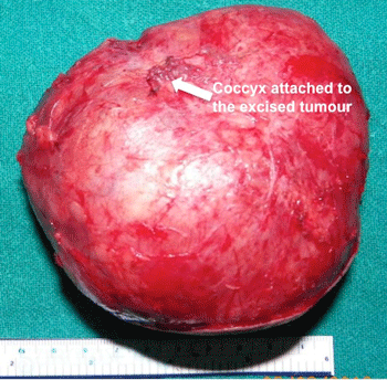 After preoperative stabilization, the neonates underwent complete excision of SCT with coccygectomy (Fig. 2) by posterior approach in prone position through an inverted chevron incision. Laparotomy was not required in any case. There were only 2 patients who could be classified as Altman Type II, the rest being Altman Type I. All neonates needed intra-operative blood transfusion. Postoperative ventilation was necessary in only 1 baby. All excised specimens were subjected to histopathological examination (HPE), which revealed mature teratoma (n=8), grade 1 immature teratoma (n=1) and grade 3 immature teratoma (n=1).