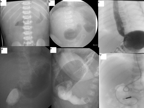 Ultrasound scan of the cranium was normal. Abdominal ultrasound scan showed fluid filled distended first part of duodenum and collapsed distal bowel loops with an appearance of luminal structure like a diaphragm in the lumen of the duodenum. She underwent upper gastrointestinal contrast study and the pilot film showed double bubble appearance (Fig. 1b). There was severe gastro-oesophageal reflux up to thoracic inlet level (Fig. 1c). The stomach was hypertrophied and dilated up to first part of duodenum which was dilated (Fig. 1d). Lateral view demonstrated clear windsock deformity but it was difficult to see the rim of the attachment of the diaphragm on the duodenal wall (Fig. 1e).