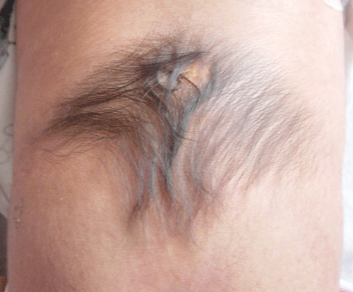 Figure 1: Note hypertrichiosis (Faun tail) with a patch of aplasia cutis congenital and dermal sinus tract. |