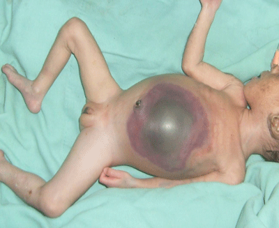 There were 9 males and 7 females, aged 0-28 days (median age= 7days). Their weights at presentation was 0.9 - 4.7kg (median=2.6kg). ) Five infants were premature. The interval between the onset of symptom and presentation was > 72hours in 12 infants (Table 1). Twelve neonates presented with varying levels of metabolic and cardiopulmonary derangement. One of them had associated gangrene of more than 75% of the anterior abdominal wall (Fig.1). The diagnosis of GIP was made based on clinical features, supported by plain X-ray (babygram) findings. All the infants were managed in the Special Care Baby Unit of the hospital. All received adequate resuscitation before surgery.