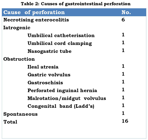 Necrotizing enterocolitis was the cause of perforation in 6 infants: 4 of these infants were premature, 5 had multiple perforations, and all had been fed infant formula feeds prior to onset of symptoms. Obstructive pathologies causing perforation are shown in Table 2.