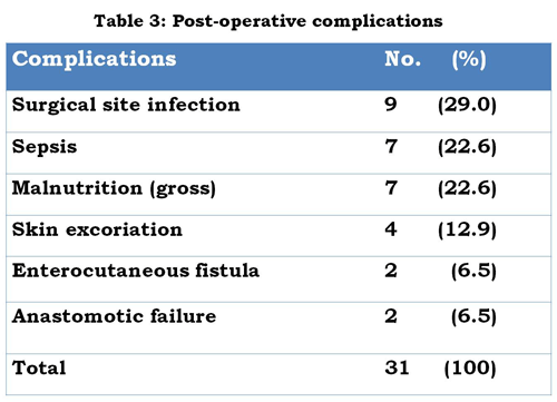 Table 3 shows the postoperative complications encountered. In all, 7 babies died giving an overall mortality of 43.8%. Sepsis and malnutrition accounted for 3 deaths each while one death was anaesthesia related.