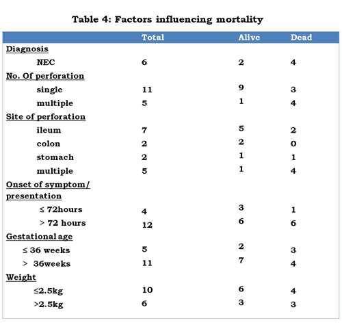 From our study NEC, prematurity, low birth weight, multiple perforations and delayed presentation are identifiable mortality risk factors of neonatal GIP (Table 4). Several other authors have documented similar findings [1, 3, 4, 6, 16].