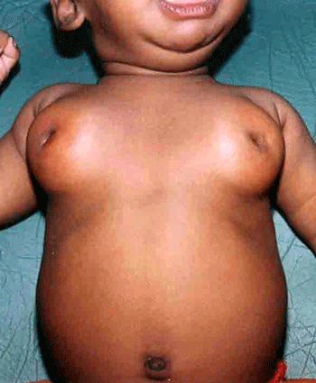 Maternal estrogen is known to cause varying degree of breast enlargement in approximately 70% of newborn. [1] Usually the diameter of breast bud measures 1 to 2 cm in the first few weeks of life [2]. But Athena has seen some of these breasts of alarming size (Figure 1). The reason for this exaggerated response is unclear. These giant breasts will be hard and tender in contrast to the soft and painless gynecomastia of older children and adolescents. Postnatally, falling levels of maternal estrogen is thought to trigger prolactin secretion in the pituitary of the newborn [1,3]. Resultant prolactinemia stimulates neonatal breasts and causes milk secretion in 5 to 20% of newborn [4]. It is popularly known as witch’s milk because it is believed in folklore that witches and goblins would feed on it [5]. Witch’s milk resembles maternal milk with identical concentration of IgA, IgG, lactoferrin, lysozyme and lactalbumin [6]. Inadequate let-out of milk, either due to improper canalization of lactiferous ducts or due to lack of oxytocin stimulus in the newborn, may lead to stagnation of milk (galactocele). Superadded infection may result in complications such as mastitis and breast abscess [7]. Athena intended to update the recent developments on this oddity of the Nature.