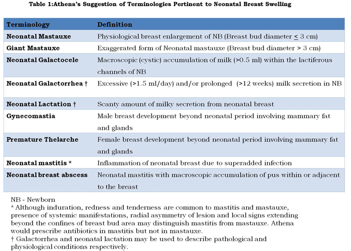 An extensive review of literature has left Athena much disappointed for many reasons. First of all, there is no proper terminology to describe uncomplicated, physiological enlargement of breasts in the newborn. Research papers seldom distinguish various forms of breast swellings in newborn such as physiological enlargement, exaggerated development, bulging galactocele, inflammatory swelling and breast abscess. Terms such as ‘mastitis’ [8,9,10], ‘galactorrhea’ [4,11], ‘gynecomastia’ [11,12], ‘galactocele’ [12,13], ‘breast hypertrophy’[14] and ‘breast enlargement’[1] have been used interchangeably to denote any of the aforementioned presentations. Notoriously, hardness (induration), hyperemia and tenderness of proliferating mammary glands are often mistaken for the signs of inflammation and hence the popular misnomer “Mastitis Neonatorum” [8]. Considerable overlap of the various presentations further mars the clarity. Imprecise terminology, lack of accurate definition and absence of diagnostic criteria have left much confusion in the literature [4]. Considerable etymological research prompted Athena to revive an obsolete term - “Mastauxe” (pronounced as mas-tawk′sē). It is a combination of two Greek words mastos (Breast) and auxein (increase in size) [15,16]. Semantically, it appears to be the right word to describe uncomplicated physiological breast enlargement of newborn under hormonal influence. The terms “neonatal mastitis”, “neonatal breast abscess” and “neonatal galactocele” are better reserved to denote complications of “neonatal mastauxe”. Exaggerated breast enlargement may be referred to as “giant mastauxe” (Table 1).