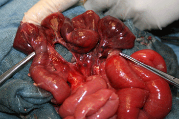 The size of the mesenteric defect varies from 2 or 3 cm to 15 cm [5]. This defect is either near the ileocaecal region or Treitz’s ligament [1]. According to Capito [6], this defect could be the first step of the formation of a bowel atresia. Its occurrence could be explained by a thrombosis with limited necrosis of the mesentery [6]. Other theories mention the occurrence of intra- peritoneal inflammation, traumatism, partial regression of the development and the induction of a mesenteric opening by the colon during its migration through the umbilical opening [1, 2, 9].