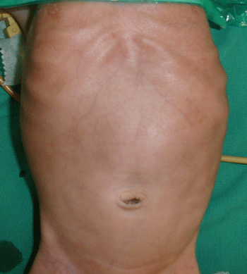 Figure 1: Upper abdominal distension due to dilated stomach with visible peristalsis. |