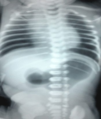 A 8-day-old boy weighing 1.9kg, born preterm at 32 weeks gestation as a normal delivery with a birth weight of 2.3kg with good Apgar score, was referred for non-bilious, non-projectile vomiting of curdled milk immediately after feeds. Examination revealed upper abdominal distension with visible peristalsis from left to right (Fig.1). An erect X ray of the abdomen (Fig. 2) showed a dilated stomach and no gas in the abdomen distal to the pylorus. An air contrast study was done which again showed a dilated stomach and no gas distally. An ultrasound abdomen showed gaseous distended stomach with a short segment thickening of pyloric wall obliterating the pyloric lumen. Following correction of electrolyte and acid base imbalance, with a diagnosis of pyloric obstruction, suspected pyloric atresia, the neonate was explored to find a congenital pyloric atresia with no gap between the two ends. Resection of the pylorus with anastomoses of the antrum of the stomach with the first part of the duodenum was done safeguarding the structures posterior to the first part of the duodenum. Broad spectrum antibiotics and total parenteral nutrition through a central line were the mainstay of post-operative management. The post-operative recovery was thus uneventful and the baby was discharged on 12th post-operative day on full breast feeds.