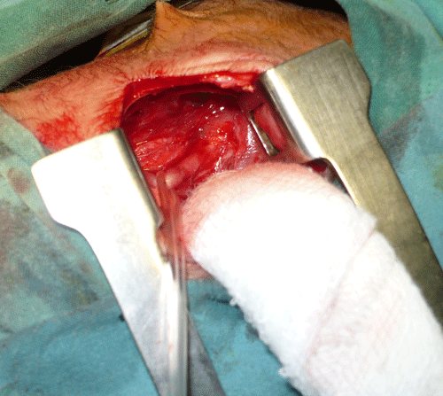 A 2-day-old female neonate, weighing 2.7kg, presented with salivation, frothing, and choking at feeding attempts. There was a history of polyhydramnios in mother. The baby was a product of non-consanguineous marriage and delivered at term by normal vaginal delivery in a private hospital. General physical examination was unremarkable. There were no visible associated anomalies in the baby. Chest and upper abdominal radiograph showed feeding tube curled just beyond thoracic inlet and a big gastric shadow. Laboratory investigations were within normal limits. Patient underwent right thoracotomy which revealed agenesis of azygos vein (Fig. 1). Primary esophageal repair was done with mild anastomotic tension. Postoperative recovery was uneventful. Echocardiogram done postoperatively showed structurally and functionally normal heart. Patient was discharged in good general condition.