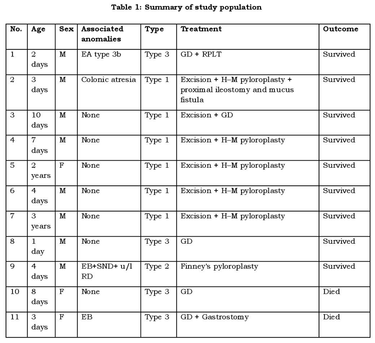 Eleven cases with the diagnosis of CPA were treated at our hospital. There were eight males and three females. The age at diagnosis ranged from one day to three years. The main presenting symptoms were non-bilious vomiting and upper abdominal distension. The two toddlers presenting late also had failure to thrive in addition to the above symptoms. One of our patients was admitted as a case of esophageal atresia with distal trachea-esophageal fistula was subsequently found to have CPA after a babygram. In nine patients, the diagnosis was made preoperatively on plain abdominal X-ray, which showed a single, large air bubble representing the dilated stomach with no gas distally. Contrast study of abdomen revealed distended stomach and non-passage of contrast beyond pylorus. The two patients presenting late were diagnosed intra-operatively. Associated colonic atresia in one patient was also diagnosed intra-operatively. [The two patients presenting late were diagnosed intra-operatively along with the one having associated colonic atresia.]