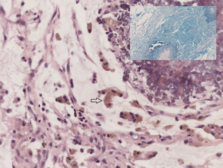 Figure 1: Histological images of omental mass excised during inguinal herniotomy in our patient displaying omentum with meconium-laden macrophages (arrow), Haemotoxylin and Eosin stain, magnification X40; [Inset displaying mucin, stained with Alcian blue, magnification X10] |