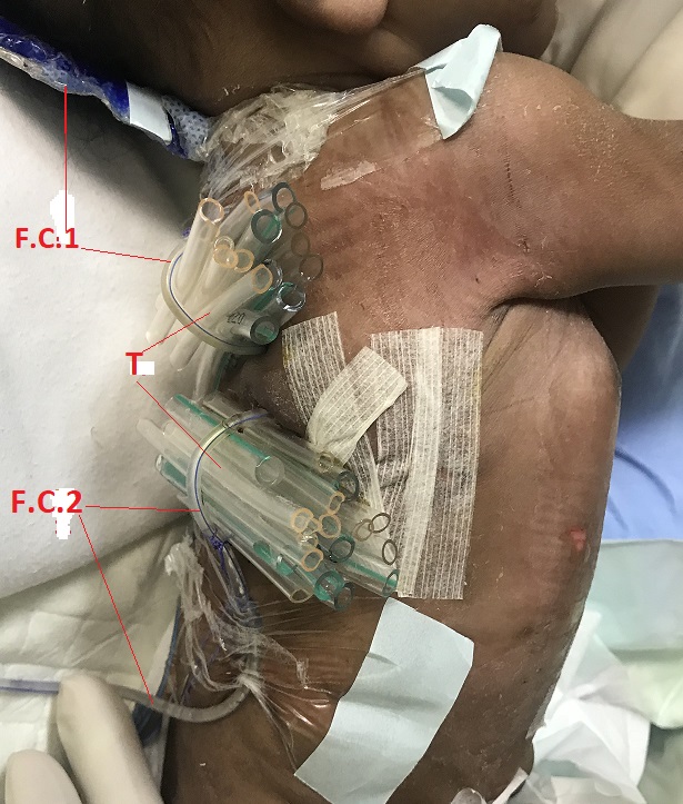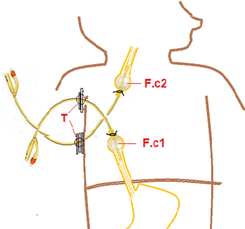 Figure 1 An illustration of the technique. F.c1 (Foley catheter 1); F.c2 (Foley catheter 2); Pieces of traction tubes for incrementing tractions. |