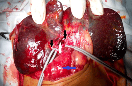 Figure 1: Intra-operative picture of portal dissection during Kasai procedure. Black arrows – right and left portal veins, White arrow – fibrous cone transected at porta, Blue arrow-Duodenum. |