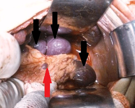 Figure 2: Intra-operative picture of polysplenia, Black arrows – multiple spleens, Red arrow – splenenculus in mesocolon. |