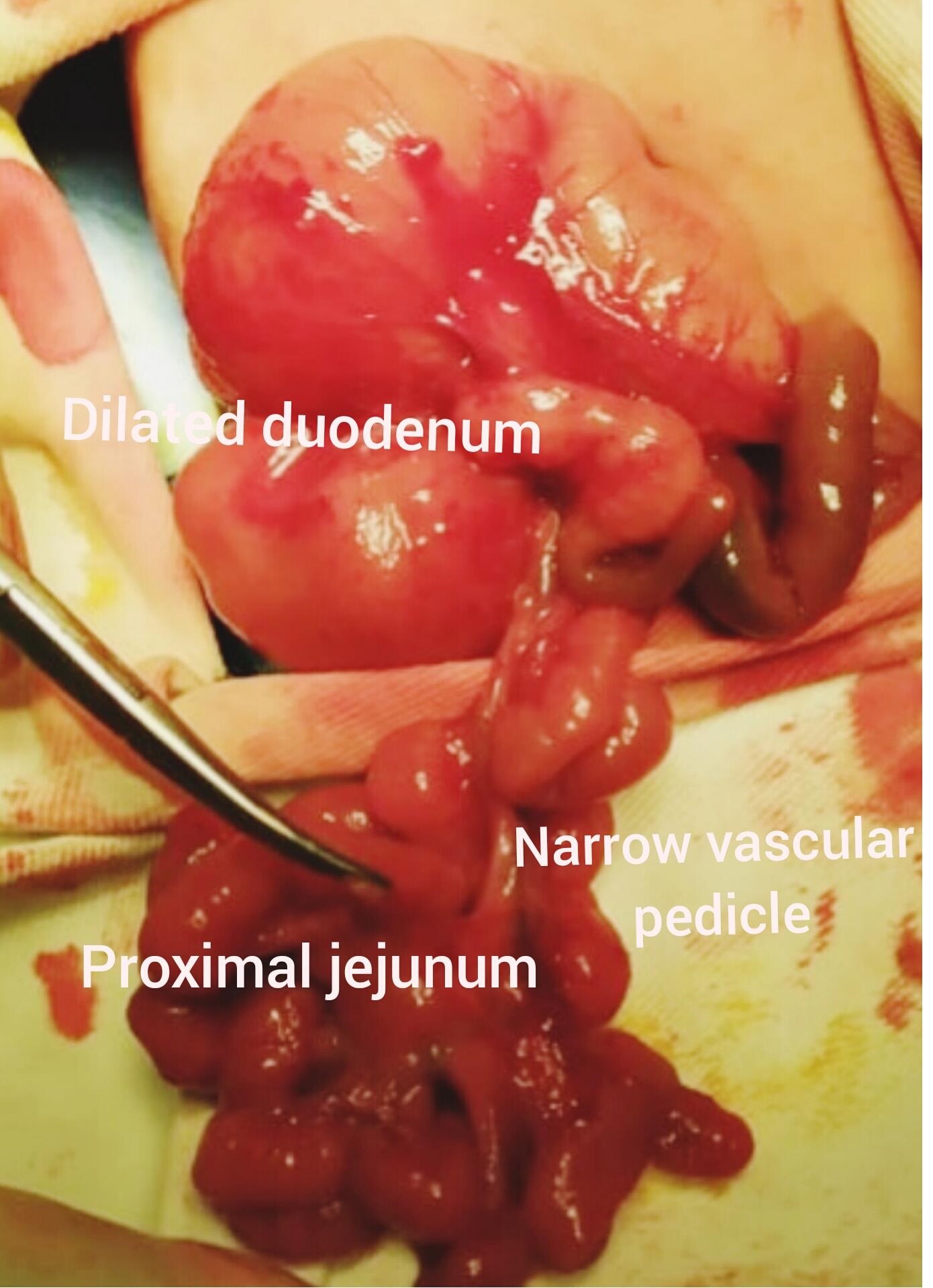After confirming the distal patency, we tried to straighten the small gut but failed. We resected the most distal 2 cm of the duodenum and made an end to side anastomosis between the end of the duodenum and the ante-mesenteric border of the jejunum, 5 cm from its proximal end. The proximal end of the jejunum was then brought out as a stoma (Bishop Koop enterostomy). We left some degree of twisting of the small gut as it was not compromising the vascularity and the vascular pedicle was fixed along the medial border of the dilated duodenum to prevent further torsion.