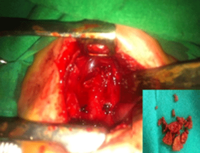 Figure 1: Intra-operative photograph revealing intact esophagus; inset shows extracted beetle nut pieces. |