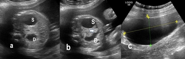 a) Antenatal Ultrasonography at 28 weeks 4 days showing dilated stomach (S) and duodenum (D) giving the Double-bubble sign. b) Hyperechoic band around duodenum (arrow). c) showing the maternal right ovarian cyst |