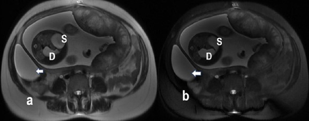 Axial single-shot fast spin-echo with breath-hold (a) and fat-saturated (b) MR images confirming the ultrasound findings. Dilated fetal stomach (S) and duodenum (D) were seen. Maternal right ovarian cyst showed benign features with no evidence of septation or nodule (arrow) |