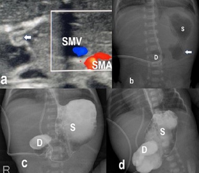 a) Postnatal transverse ultrasonography with color doppler study showing dilated stomach and hyperechoic band around the duodenum (arrow). The normal relationship of superior mesenteric vessels was noted on color doppler ultrasound. b) Frontal radiograph of the abdomen showing distended air-filled stomach (S) and proximal duodenum (D) giving the Double-bubble sign. A feeding tube was also seen with a tip in the stomach (arrow). c-d) Upper GI contrast study spot images AP (c) and right anterior oblique (d) showed distended stomach, D1, and proximal D2 segments of the duodenum. No passage of contrast was seen beyond the 2nd part of the duodenum. |