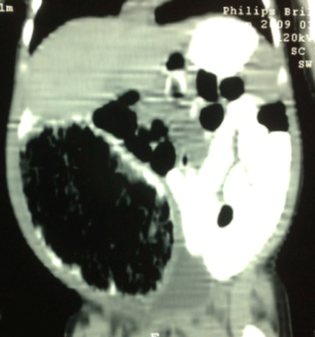 Case 2:A 2-month-old male baby, previously operated on 2nd day of life for omphalocele minor, presented with abdominal distention associated with regurgitation of feed and irritability. On examination, there was a palpable mass which was soft, smooth, and slightly mobile. The erect abdominal radiograph showed a soft tissue shadow in the right iliac fossa pushing the bowel to the other side. CT scan of the abdomen showed huge cystic mass in the abdomen (Fig. 3). On exploration there was a cystic duplication of the terminal ileum which was excised along with resection of the bowel related to the cyst with end to end anastomosis. Patient is doing fine on follow-up.
